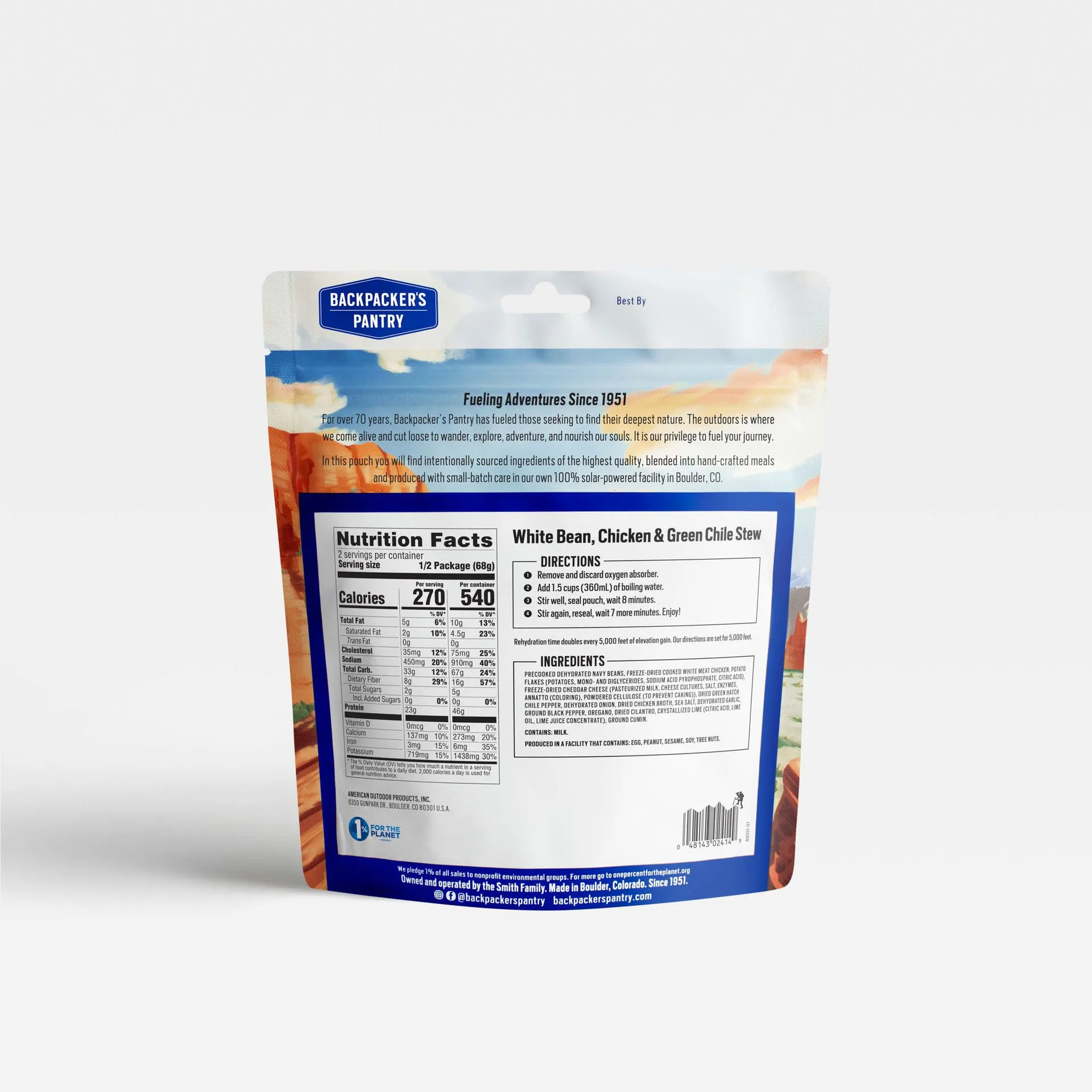 Precooked Dehydrated Navy Beans, Freeze-Dried Cooked White Meat Chicken, Potato Flakes (Potatoes, Mono- and Diglycerides, Sodium Acid Pyrophosphate, Citric Acid), Freeze-Dried Cheddar Cheese (Pasteurized Milk, Cheese Cultures, Salt, Enzymes, Annatto (Coloring), Powdered Cellulose (To Prevent Caking)), Dried Green Hatch Chile Pepper, Dehydrated Onion, Dried Chicken Broth, Sea Salt, Dehydrated Garlic, Ground Black Pepper, Oregano, Dried Cilantro, Crystallized Lime (Citric Acid, Lime Oil, Lime Juice Concentrate), Ground Cumin.