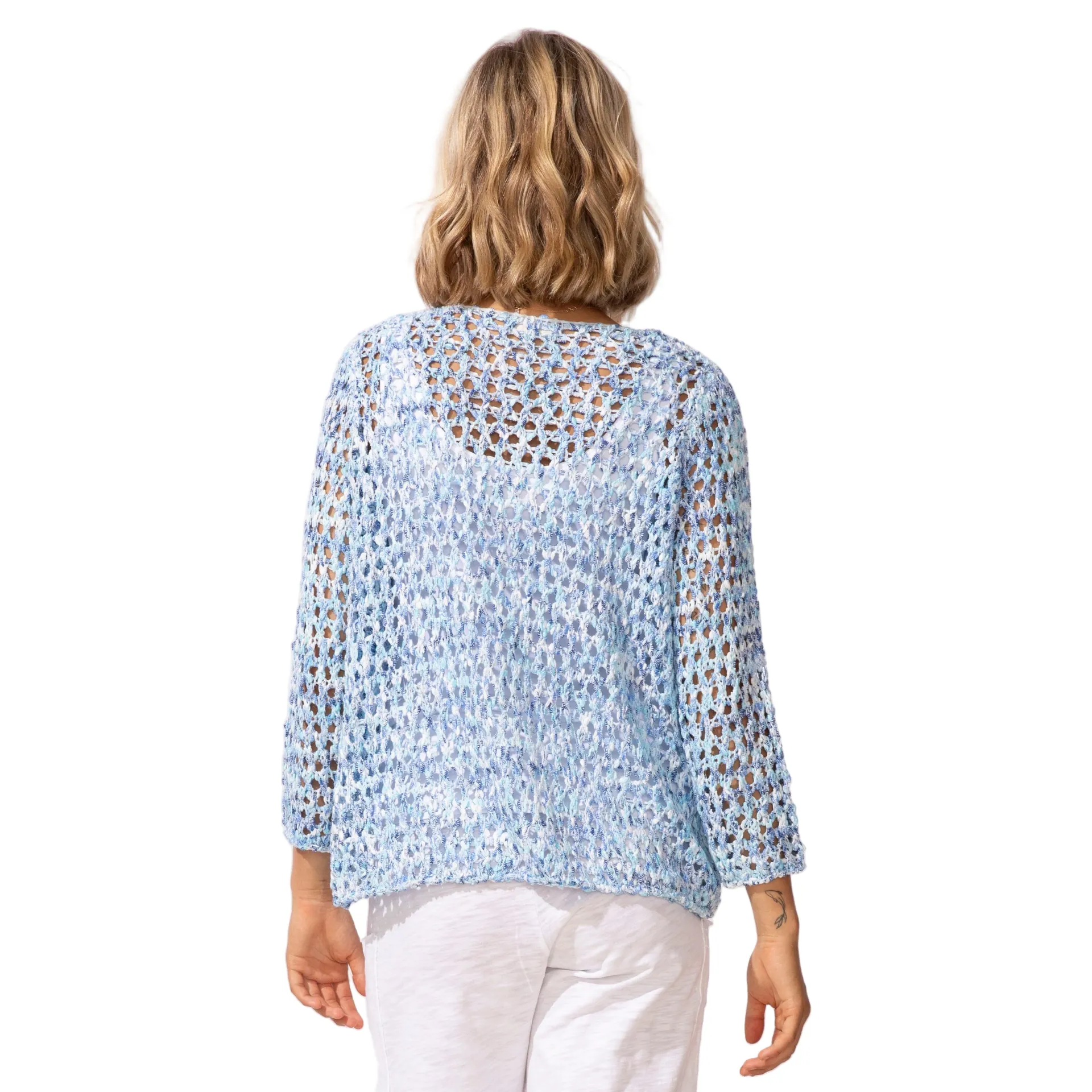 Hi twist multi colored yarns create subtle texture and nuanced color variances. Super soft, light weight open knit is perfect when you need a cool stylish layer. A subtle floral pattern elevates this summer staple.