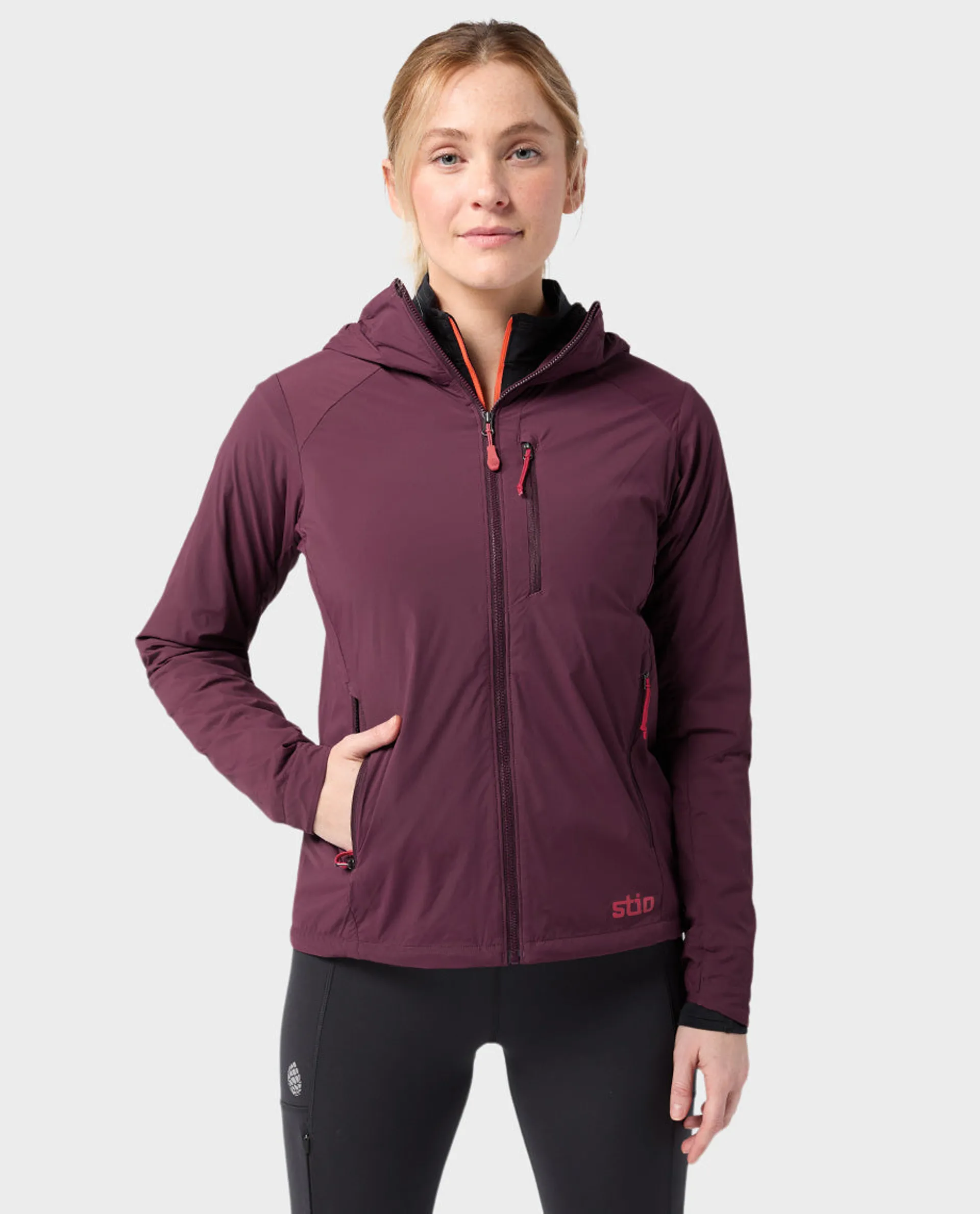 For mobility, the durable stretch outer moves with you and allows sweat to escape, with a DWR finish that sheds light precip. It can compress into one of its own lined, zippered hand pockets for easy stashing in a running vest or summit pack.
