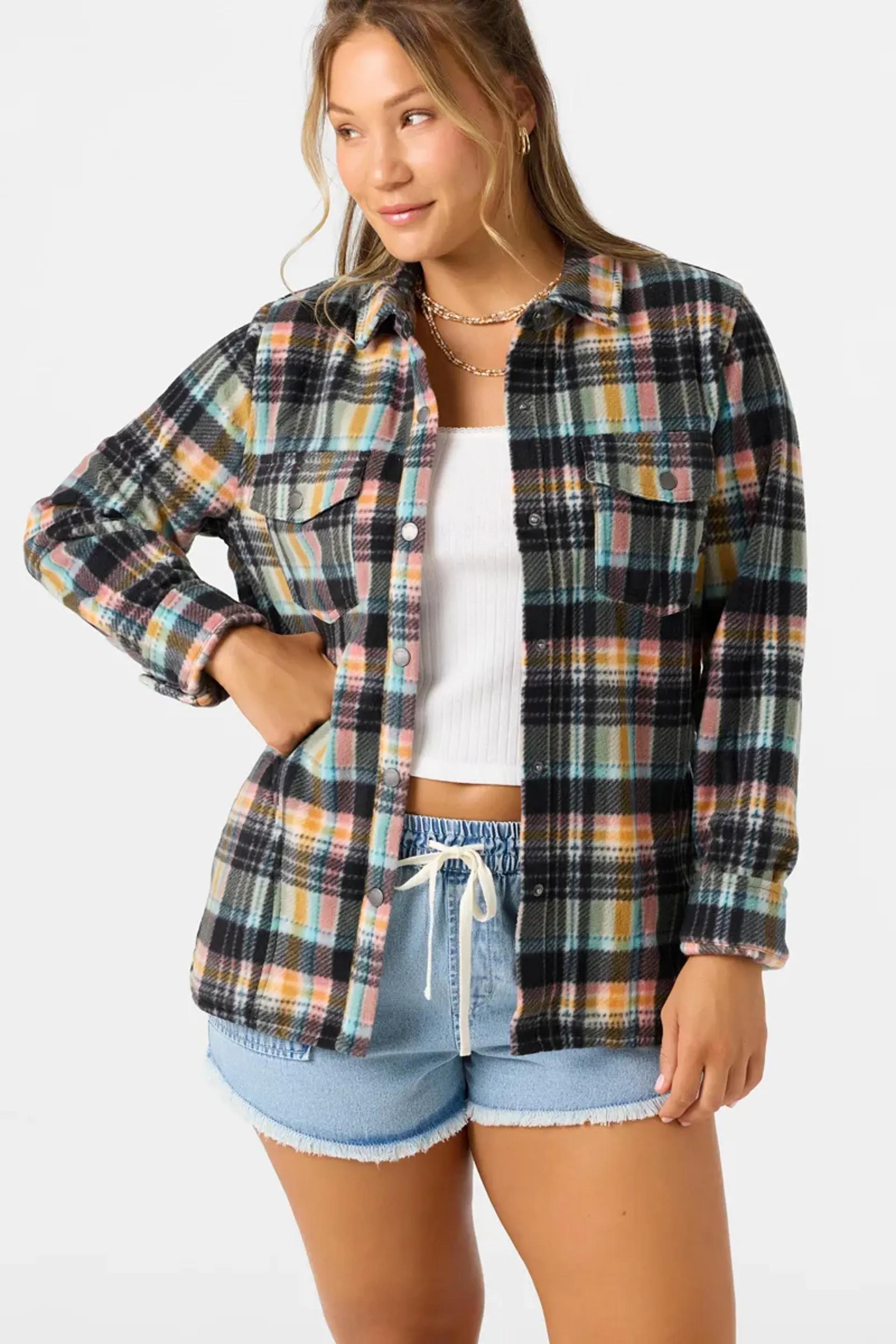 This plaid beauty boasts a super-soft feel, snap-up closure, and just the right length to pair perfectly with your favorite bottoms.