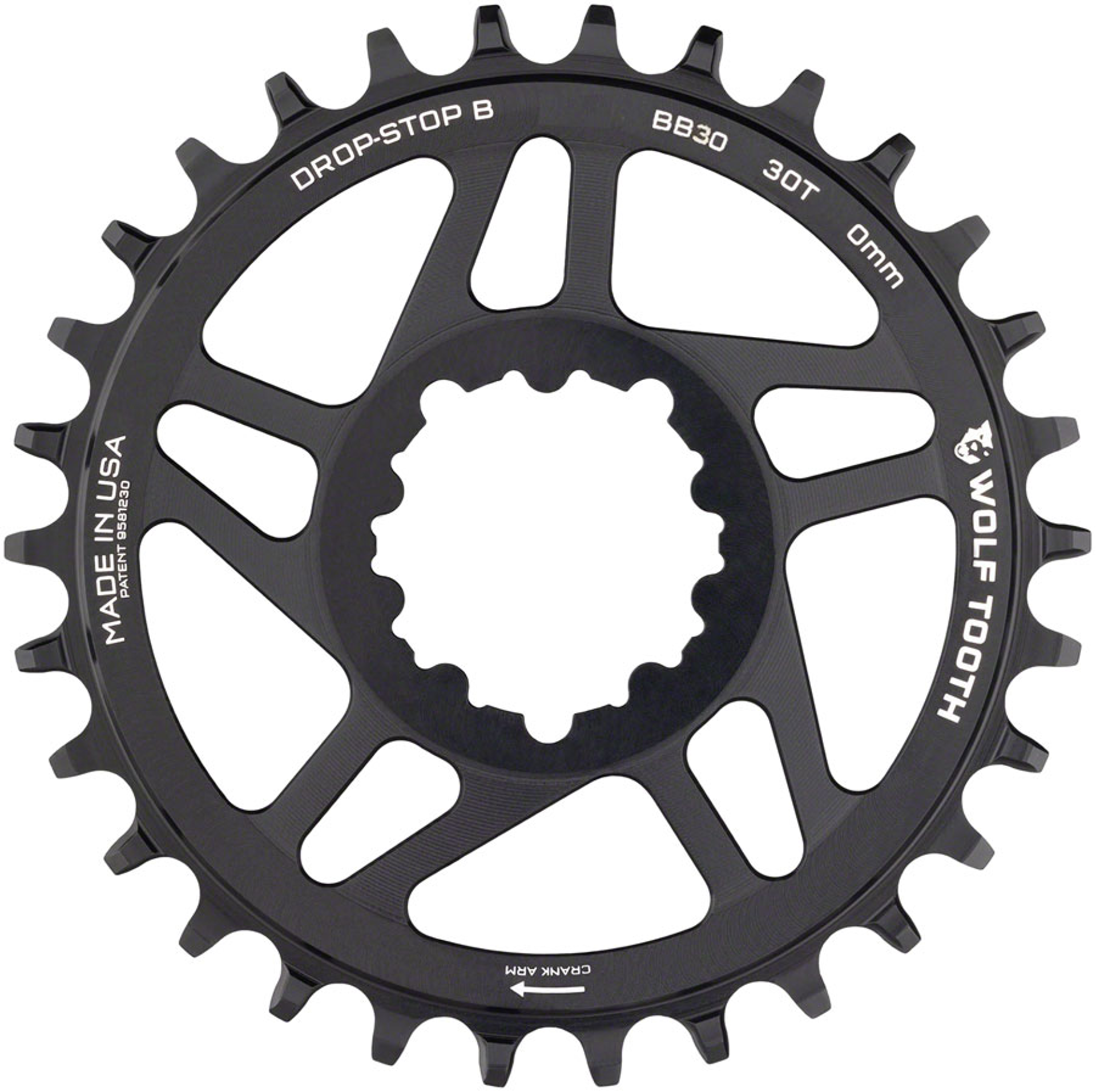 This premium 7075-T6 aluminum alloy chainring is equipped with the patent pending Drop-Stop asymmetrical tooth design for the best in wear life, mud clearance, and chain retention. Drop-Stop chainrings are designed for use with 1x9, 1x10, 1x11, and 1x12 drivetrains. They are compatible with all 10-, 11-, and 12-speed chains, with the exception of Shimano 12-speed chains. Shimano 12-speed chains require the use of Wolf Tooth's Shimano 12-speed specific chainrings. If using a 9-speed drivetrain, use a 10-speed chain, which will provide a tighter fit for better chain retention. Note that this chainring is not compatible with the SRAM 8-bolt interface.