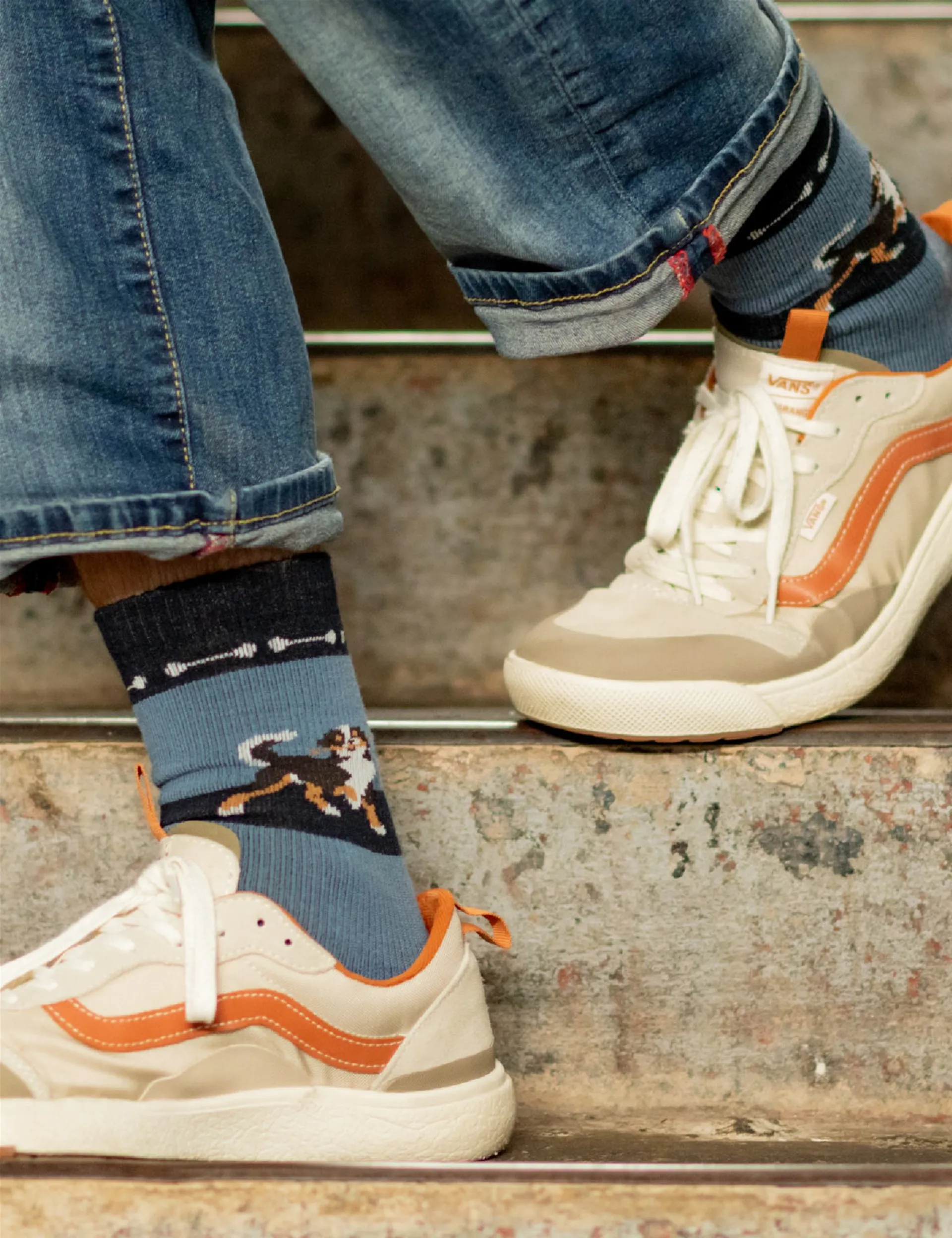 Featuring a delightful doggie holding a stick and a charming bone pattern circling the top, these socks will fetch you plenty of compliments, during everything from daily walks to dog park adventures! Light cushioning and crew height offer 'pawsome' comfort no matter how much tail-wagging excitement comes your way. Made from American-sourced merino wool, ensuring comfort from toe to top.