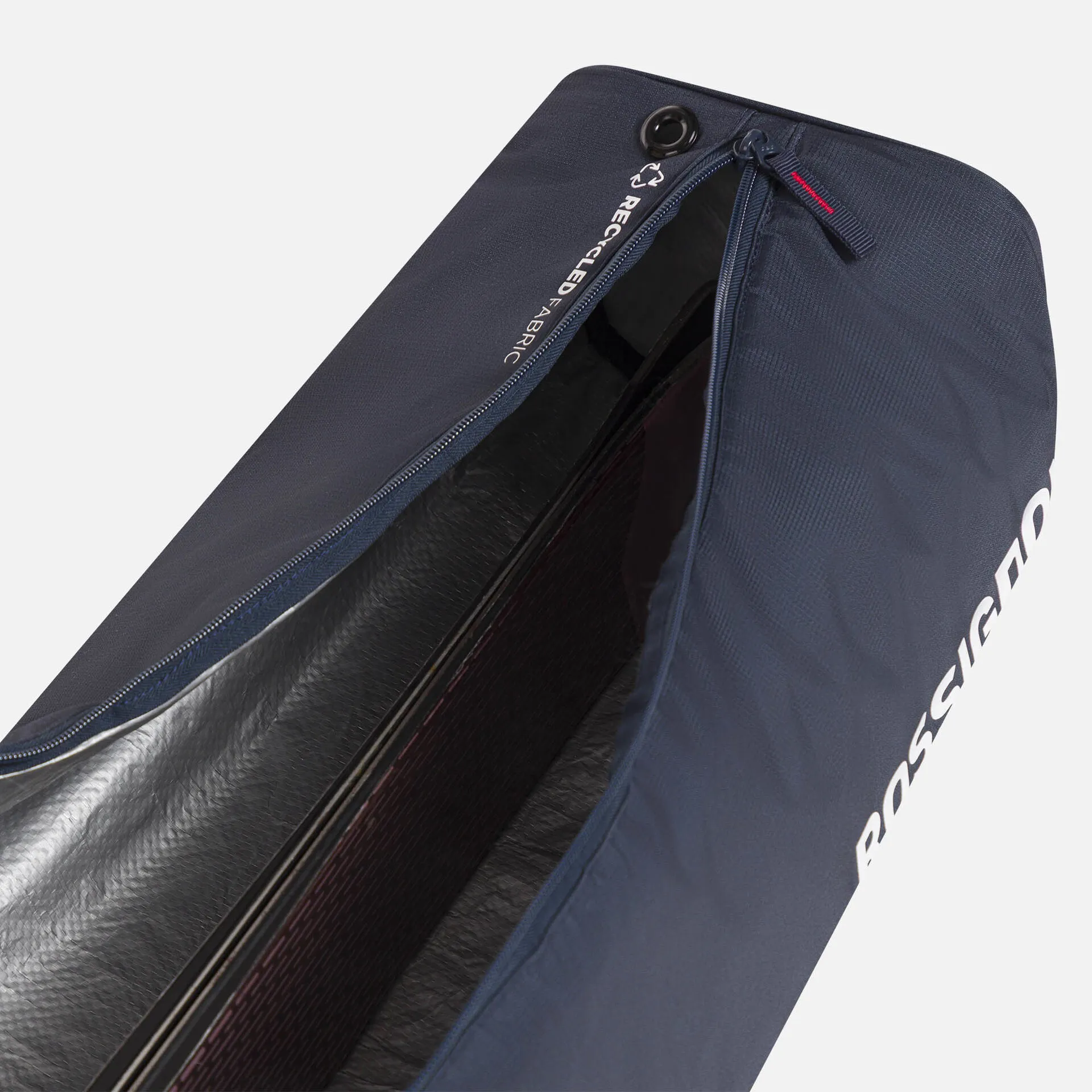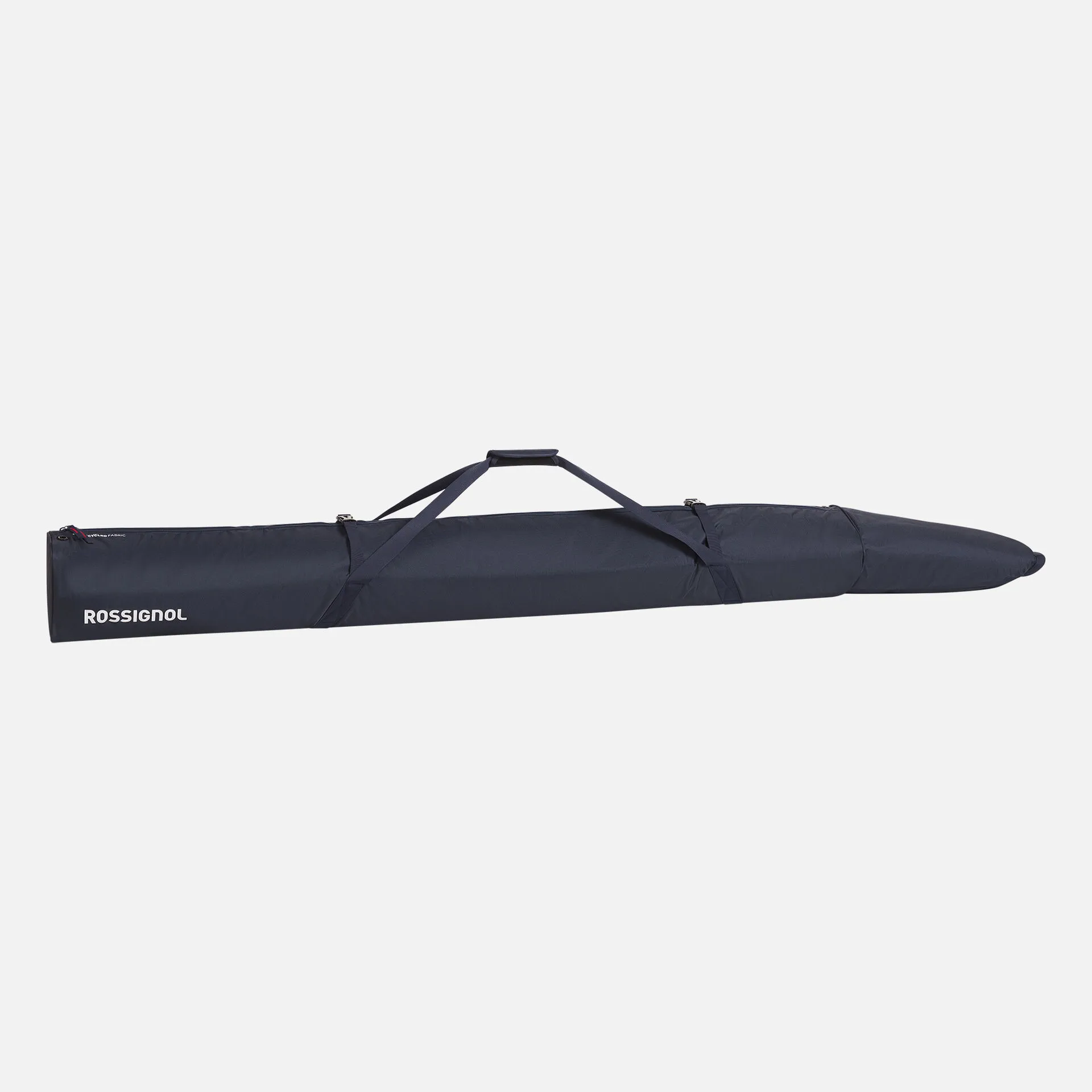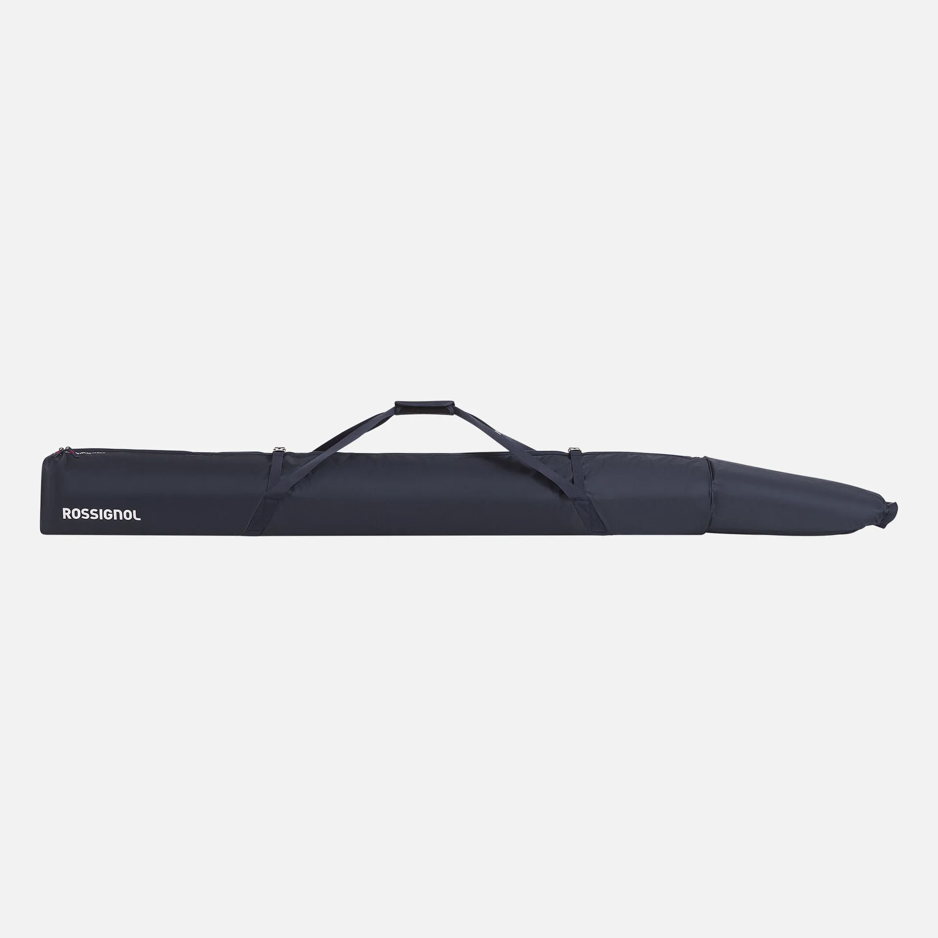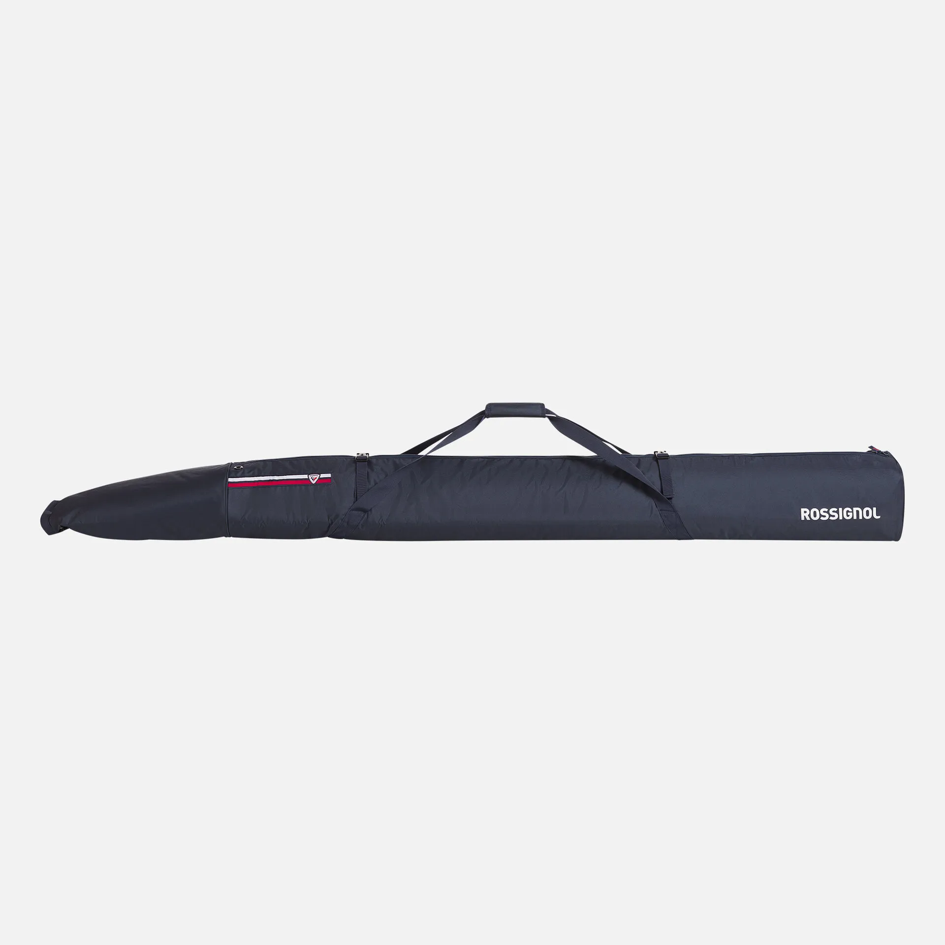 The Rossignol Strato Extendable Padded Ski Bag holds one pair of alpine skis for travel by plane, train, or car. The roll-top design allows adjustment to meet the length of your skis, accommodating skis from 160cm to 210cm long. The bag is padded to help protect your gear. Its blue color and iconic tricolor stripes recall the legendary Strato ski legacy.